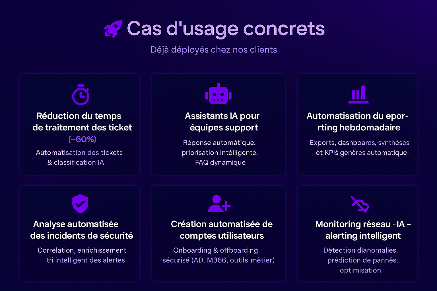 le tout intégré naturellement à vos outils existants (GLPI, Jira, Fortinet, Palo Alto, Microsoft 365, etc.).